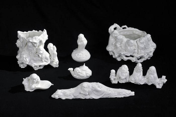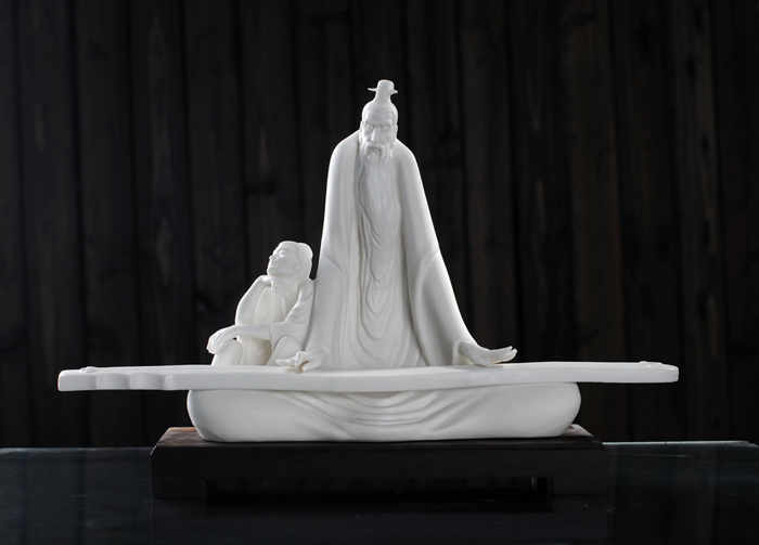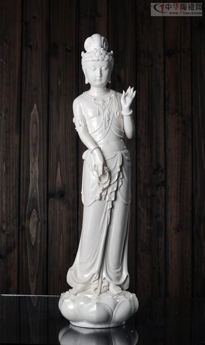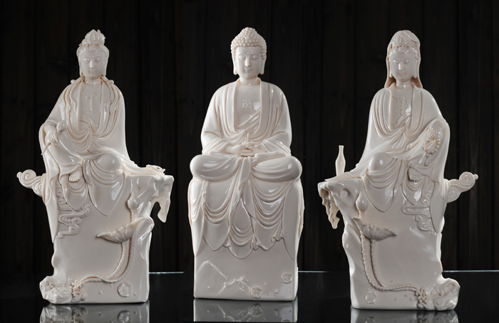 作品简介:西方三圣显现的特征,特令众生容易观想,容易忆念。譬如我们对于父母和兄弟姊妹,无论相距若干里,相隔若干年,每一闭目忆想,他们的面型毛发皆现,如在目前。何以故?久习熟知其特征,且天性相关,深印识田。《西方三圣》继承了瓷都千年来的传统雕塑技术,形成了自己独特的艺术风格,产品洁白坚硬、色泽莹润、胎体滑润致密。釉面晶莹光亮,是中国白德化白瓷器之尚品,东方之珍品瓷。