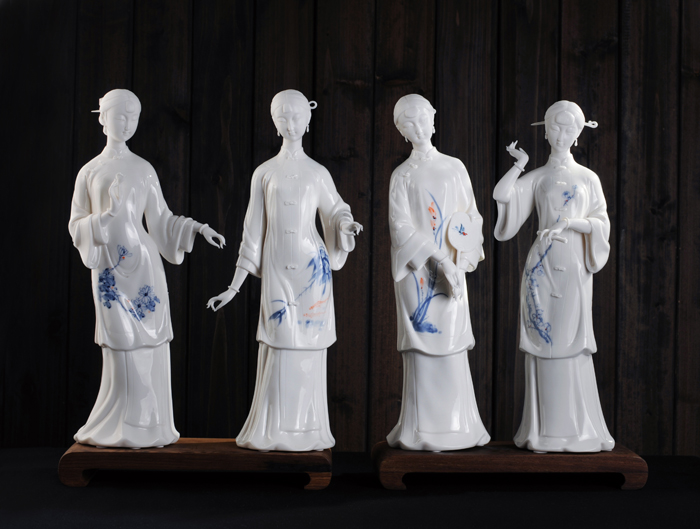 作品简介:梅兰竹菊被人称为“四君子”,正是根源于对这种审美人格境界的神往,作者巧借德化温润如玉的“中国白”精雕细刻,精致的发簪、飘逸的裙摆、纤细的手指、灵动地把“四君子”傲、幽、坚、淡的品质表现出来。《梅兰竹菊》获第四届福建省陶瓷艺术设计创新评比金奖。