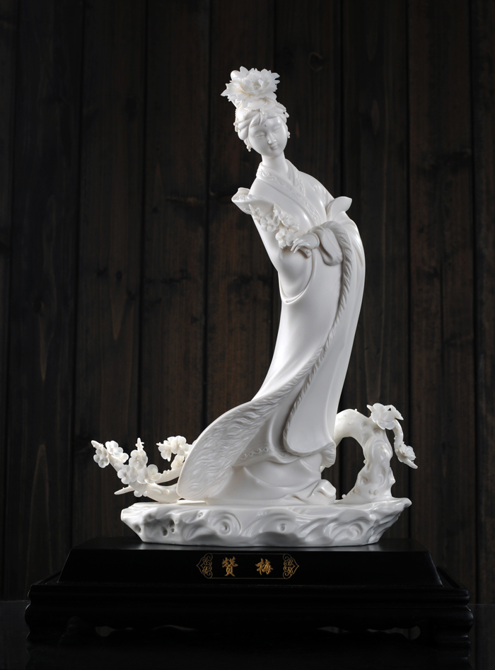 作品简介:作品《赞梅》造型生动,比例合理,表情丰富,线条柔美,作品以形写神,形神兼备,气韵生动,人物宛然如生、呼之欲出。细腻的瓷质烘托出人物的精神气质和内在性格。人物细腻生动、丰肌秀骨,并且运用雍容华贵的考究服饰展现女性热爱美追求美的唐代特点。从作品的造型上,我们能看到柔丽雅致与女性美的内在得到了统一,其所透溢出来的经典气度和高雅格调是一目了然的。