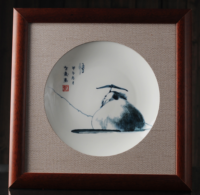 作品简介:瓷盘画是在书画的基础上发展起来的一门艺术,它融瓷器工艺与书画艺术为一体,既显示了画家的艺术水平,也展示了工匠的高超技艺。它不是艺术品单纯的复制和搬用,而是采用多种工艺进行制作,精工细雕,一丝不苟,从而使其达到了毛笔在宣纸上作画的笔墨效果和韵味。《悟》以白瓷以底,老者心鹜神游,不可预知,奇妙无比。眼睛,心灵,表现,人生的过程其实是不断悟的过程。真正的悟者能够从看破红尘获得一种眼光和智慧,使他身在红尘却不被红尘所惑,入世人保持着超脱的心境。