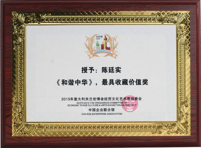由中国国际商会投融资服务委员会,中国民族贸易促进会,华夏文化传媒集团联合主办,意大利米兰世博交流中心,米兰世博会中国企业馆支持的2015年意大利米兰世博会经贸文化艺术展颁奖典礼于2015年12月8日上午在全国政协礼堂金色大厅隆重举行,原全国政协副主席李蒙、中国人民解放军原副总参谋长张黎上将及米兰世博会经贸文化组委会有关领导出席会议并发表讲话,来自世界各地的政要,商贾,艺术家,等数百人出席了此次颁奖盛会。