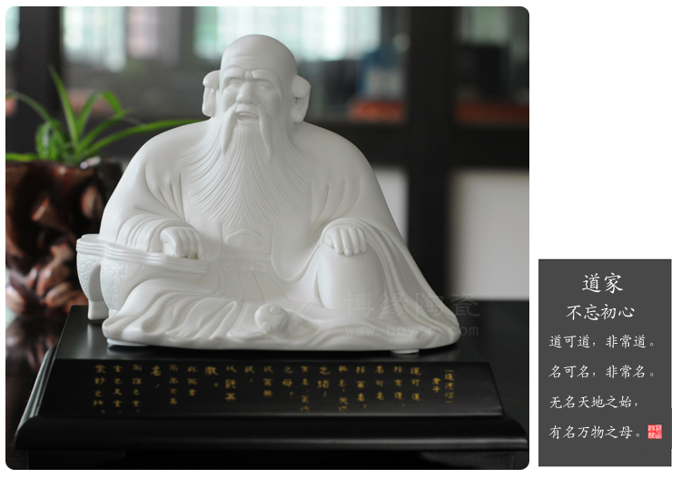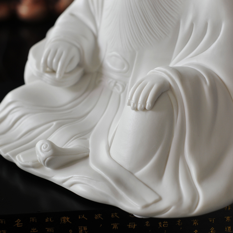 老君岩陶瓷雕塑作品以泉州清源山景区道教老君石雕造像为原型,采用陶瓷雕塑工艺经工艺美术大师设计塑造,精选上等德化白瓷瓷泥,经72道工序手工制作,并在1300多度高温下烧制而成。作品精雕细刻,老君屈膝席地,双手平放膝上,两眼平视,充分显示出慈祥和蔼、从容安乐的神态。身上衣褶分明,线条刻划柔而有力,头、额、眼、须等细部雕刻精致写实。