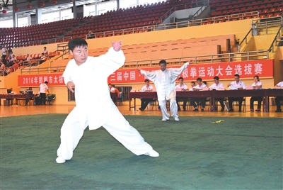 8月25日,由邯郸市体育局举办的第十三届邯郸国际太极拳运动大会选拔赛在邯郸市体育馆开赛,来自邯郸市21个县(市)、区的32支民间太极拳队伍、近500名太极拳爱好者参加了比赛。选拔赛为期4天,将于8月28日结束。主办方将择优组织一、二、三等奖的选手参加9月份开幕的邯郸国际太极运动大会。