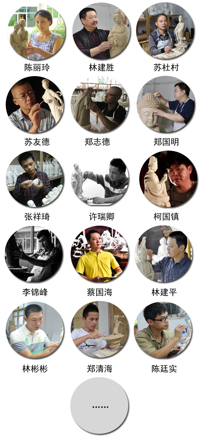 本次展览将荟萃20多位当代德化窑实力派名家及新锐青年陶艺家近百件作品,其中有省级工艺美术大师陈丽玲、林建胜、苏杜村、苏友德、郑志德等,省陶瓷艺术大师柯国镇、张祥琦、许瑞卿等作品,新锐陶艺家陈廷实、蔡国海、曾逸腾、李锦峰、林彬彬、林建平、郑清海等。