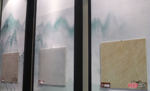 在芒果瓷砖展厅,风格化更为明显。芒果瓷砖是最早主打风格的陶企之一,一直呈现田园生活方式的风格。这次陶博会展示的新品有更多年轻化的因素——现代仿古砖新品,颜色多以黑白灰米黄为主,产品旁还会配上空间效果图,让消费者一眼能确定这是不是自己想要的空间。