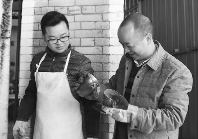 开窑是每个手艺人最忐忑的时刻,苏记茶陶的苏天培(右)对自己的作品很满意。