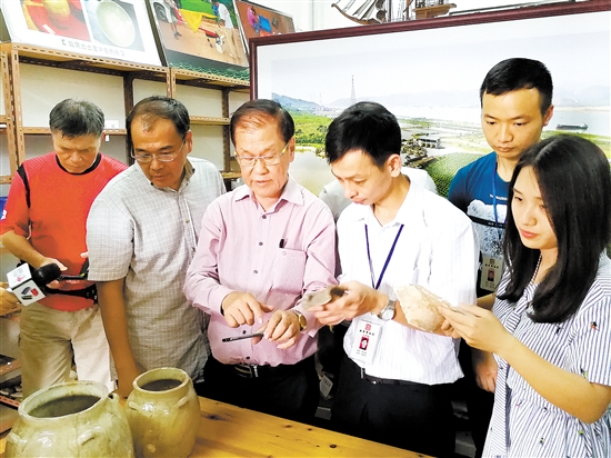 专家在新会博物馆鉴赏官冲窑出土文物。