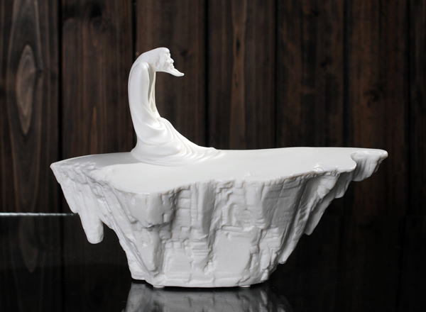 作品中,他创造性地将老者的衣物刻画得如水般,与高台融为一体,作品以德化白瓷为表现形式,素雅自然。