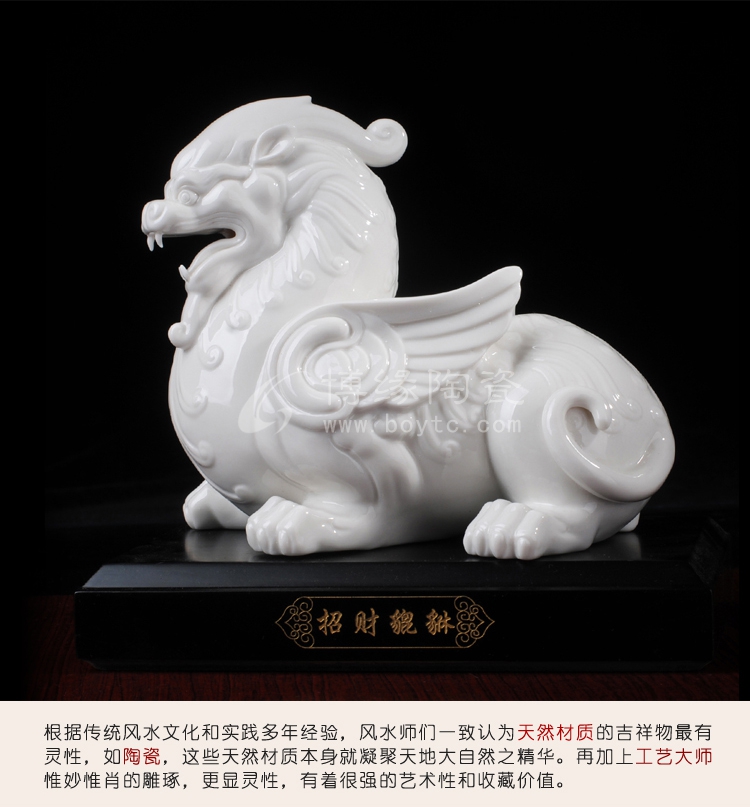 作品是由福建省陶瓷艺术大师亲手制作,貔貅霸气的外观、圆润的线条、造型独特、工艺清新且流畅,用上等等额高岭土制作而成,瓷质细腻、如脂如玉、晶莹剔透,令人爱不释手。