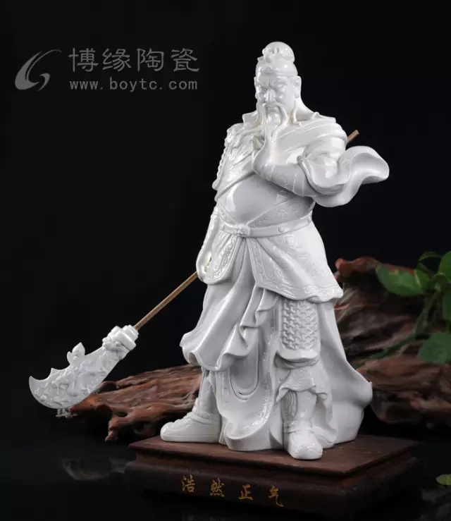 关公像是德化窑瓷塑艺术的常见题材之一。德化瓷塑在中国陶瓷史上久负盛名,它用优质的白瓷塑造神态各异的人物,以纯净莹润的釉色和生动传神的形象取胜,摒弃彩绘而追求单纯的雕塑美和原材料的质地美,独具艺术风韵。