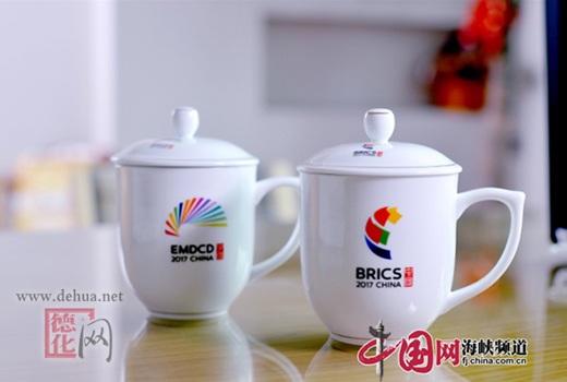 此外,德化成艺陶瓷有限公司出品的绘有金砖会标的3500件迎宾会议杯也在会议中使用。