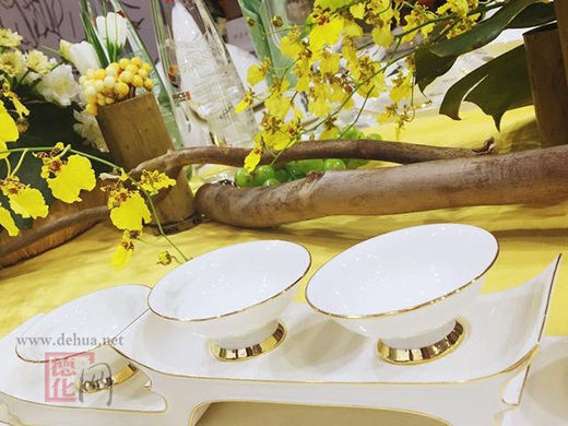 鑫五洲总经理郭建洲介绍道,“鑫五洲出品的国宴瓷“五彩祥云”,以“万国建筑博览会”鼓浪屿风光为题材,以祥云为器形主设计元素,采用德化建白瓷与鎏金工艺相结合,呈现“鼓浪元素,鹭岛风情,闽南气韵,中国情怀”。历经9个多月匠心打造,突破多项技术瓶颈,经过重重筛选,最终登上国宴餐桌,为大家展示了简约而不简单的德化白瓷。”