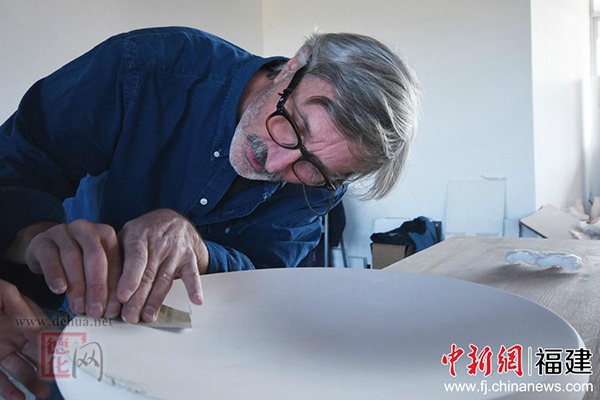瑞土日内瓦大学陶艺系教授Philippe Barde(菲利普- 巴尔德)在给餐盘打磨。