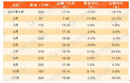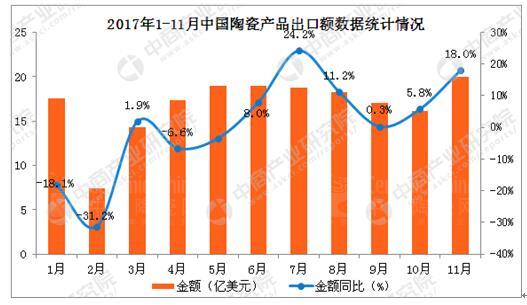 11月中国陶瓷产品出口金额19.96亿美元,同比增长18%;1-11月,我国陶瓷产品出口金额达176.17亿美元,同比增长9.7%。
