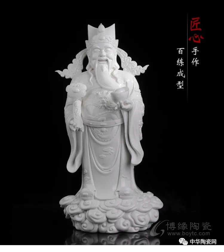 财神佛像是德化窑瓷塑艺术的常见题材之一。德化瓷塑在中国陶瓷史上久负盛名,它用优质的白瓷塑造神态各异的人物,以纯净莹润的釉色和生动传神的形象取胜,摒弃彩绘而追求单纯的雕塑美和原材料的质地美,独具艺术风韵。