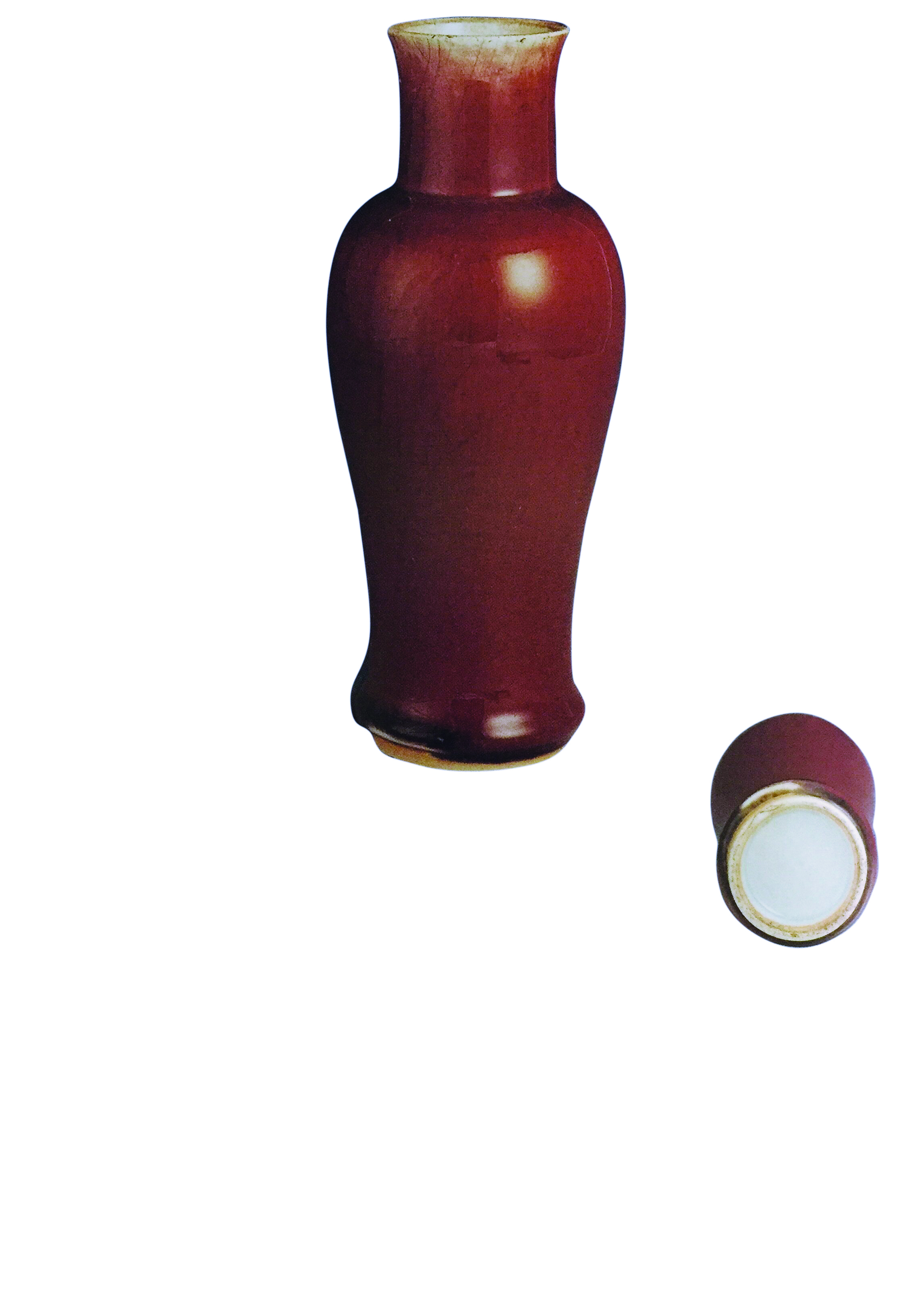 器高24.2、口径6、足径6.6厘米;器内白釉紧披胎体,色泛炒米黄,开有蝉翼般的无色细纹。胎体采用分段衔接,内腹部显露接胎痕。口端的“灯草边”已荡然无存,露出胎骨,系粉白釉易于剥落所致。器身釉面开有纵向长、横向短的交错纹片,釉色鲜红,釉面光洁、晶莹,呈宝光艳色,局部有雾气般的朦胧现象。釉内气泡细小,寥若星辰。口部红釉略薄,色泽浅淡,隐露胎色,即所谓“脱口”。器底处囤积有一周不过足的垂釉,釉厚,呈黑褐色,故郎窑红有“郎不流”之称。