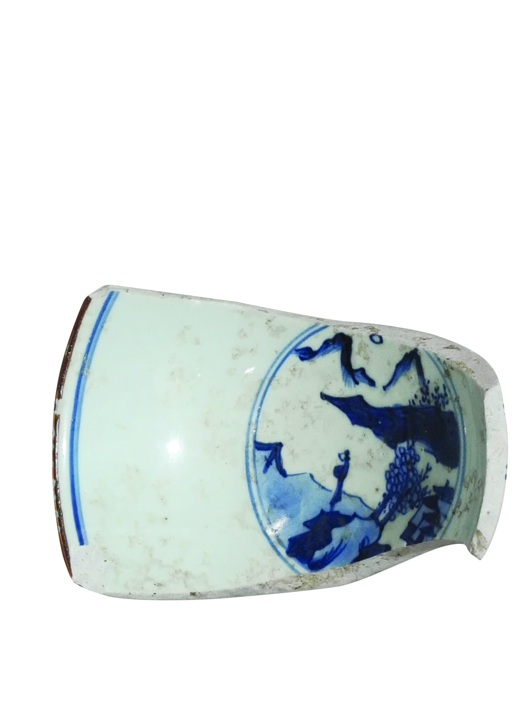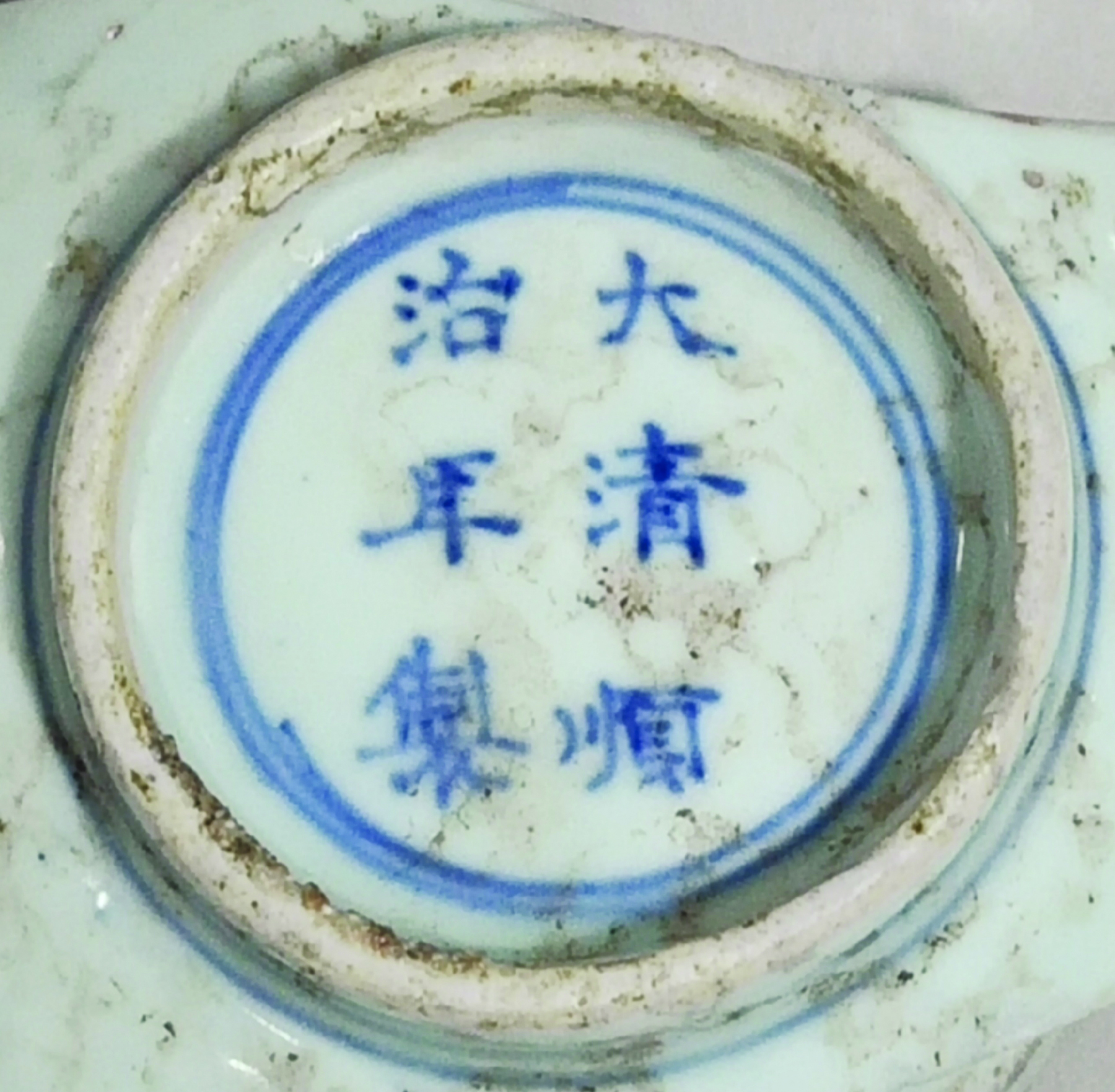 本文所述这件清顺治年间的青花残器,有天、有地、有酱口、有诗、有画、有款、有暗刻纹,碗心绘有山水人物,碗外写有文字,诗书画皆有。从研究分析顺治青花的工艺特点的角度来看,这件藏品虽然已经残损,但仍不失为一件值得收藏的实物标本。