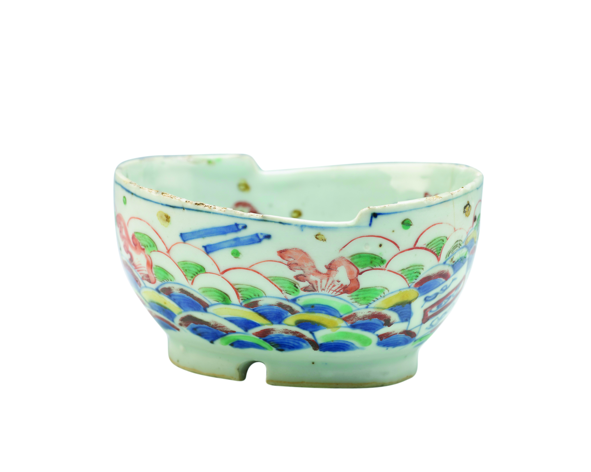 该碗呈圆形,直口,圈足。与一般的碗不同,该碗口沿的处理较为特别,从中间分别向左右斜切,形成了两个小的台阶,这样的处理,让人在视觉上产生变化。足端处理也与众不同,分别在四等分的部位,有“U”形切割孔,这应该是可以将碗安放在一些凸棱上,起固定作用的处理方式。此类造型变化的碗,日本人特别喜爱。碗在白釉之上以五彩进行装饰。外壁为海水纹,下层海水为青花的蓝色为主,并配以红、黄色;上层海水则为绿色,并勾勒红彩;海水之间绘画红色的海水波浪。海水之上有笔、锭等装饰物,碗内壁也有此类装饰,有着“必定如意”的吉祥寓意。此类碗主要销往日本,日本人爱其色彩之浓烈,称其为“古赤绘”,对日本伊万里瓷器的发展产生了较大的影响。