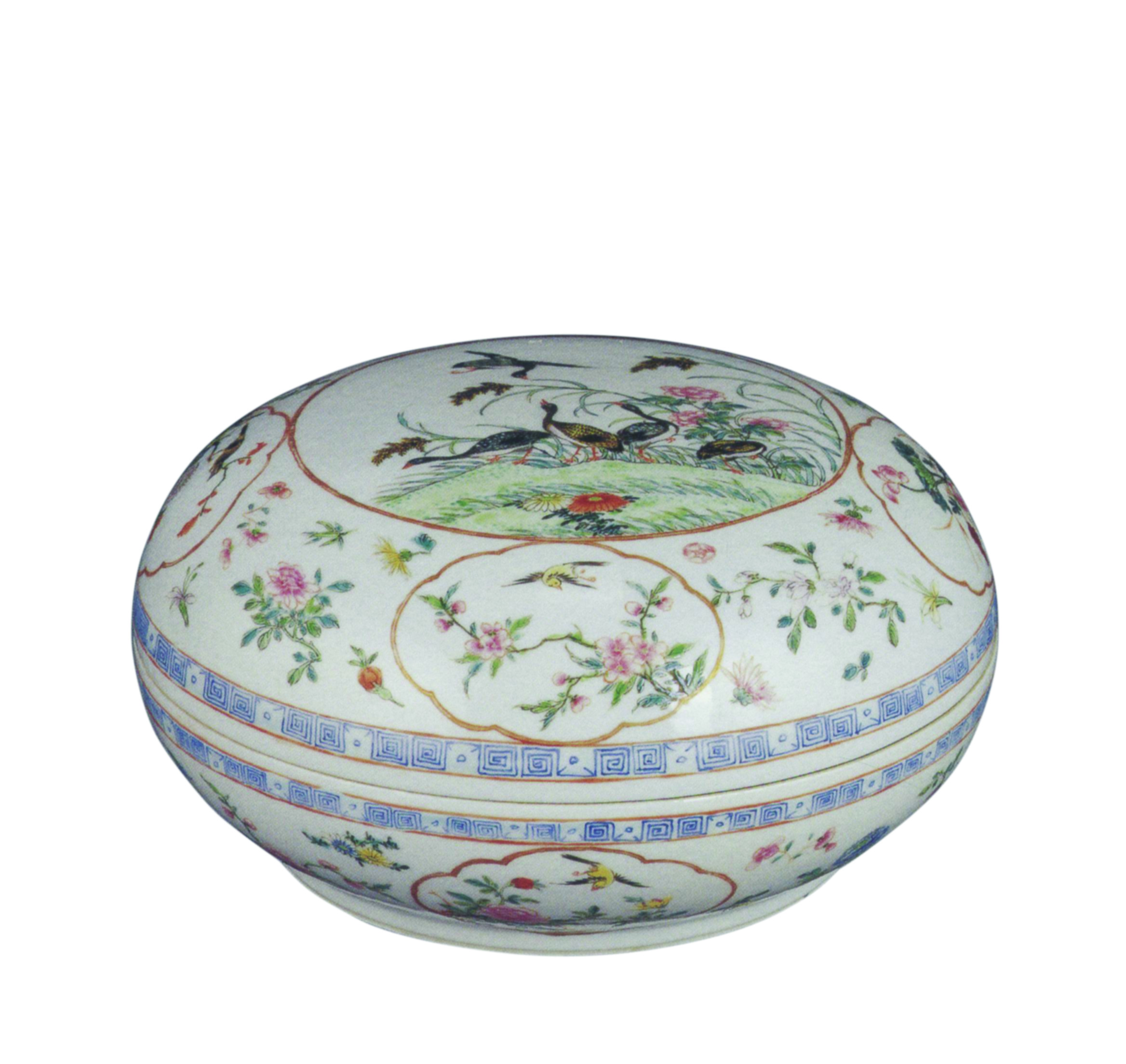清代瓷器的釉装饰发展到了极致,以各种彩瓷为主,青花次之,大量使用色釉,其中彩瓷以粉彩为代表,到中晚期更是占据了主导地位。这件捧盒器身上的图案繁复而又清新疏朗,刻意打破岁时的传统,将暮春的牡丹和盛夏的荷花等一并呈现,主题鲜明,极具装饰效果。芦苇象征禄位,牡丹象征富贵荣华,菊花象征长寿,莲花象征高洁,各个纹饰都洋溢着浓厚的吉祥寓意,组合在一起,就呈现出一缕瑞祥宁和的气息。整件器物器型硕大端整,绘工精细入微,粉彩呈色艳丽匀润,纹饰恬淡雅致,集实用性和工艺美术性于一体,显示出清代粉彩瓷制作工艺的成熟与精湛。