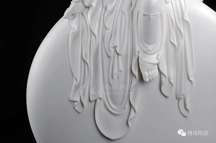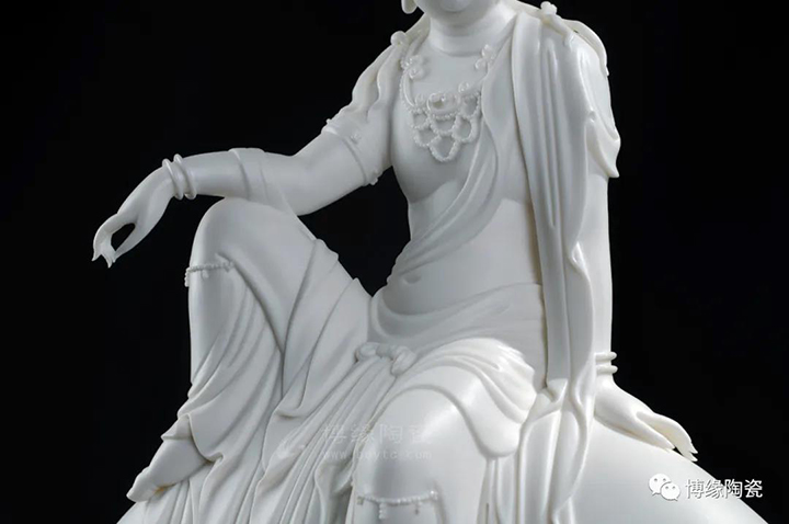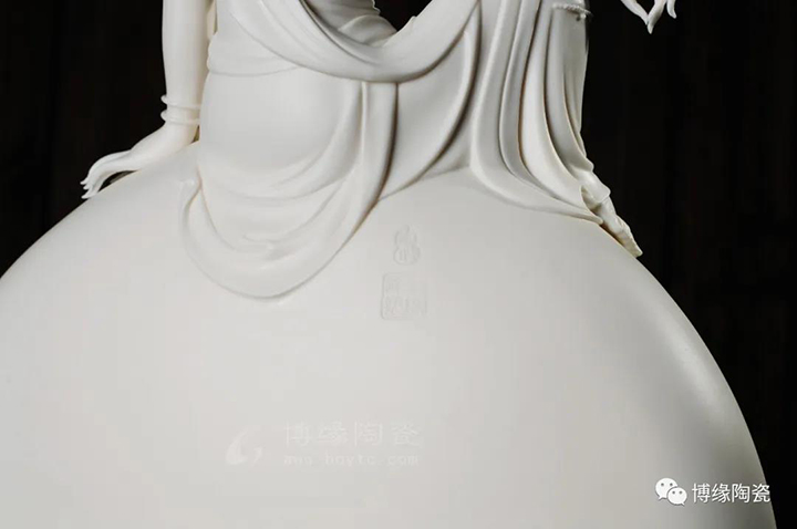 早在明代德化白瓷佛像就名声在外,一代“瓷圣”何朝宗佛像名作流传后世,成为世界各大博物馆收藏的珍品,更对佛像雕塑史上产生深远的影响,形成“何派”雕塑,其开创的捏、塑、雕、刻、刮、削、接、贴八字技法延用至今。何派观音雕塑注重于细节之美,精益求精,故而十分着意衣纹的刻画,使线条流畅,翻转自然。观其佛像,仿佛有春风拂面,衣袂飘扬的出尘之感。