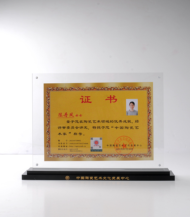 经过多年的积累,陈丹凤创作出一系列优秀作品,其作品深受广大收藏爱好者喜爱,多件作品荣获各评比金奖,作品《双龙戏珠柴烧宝瓶》荣获2021中国陶瓷艺术名家作品评比金奖等,2021年被中国陶瓷艺术文化发展中心评选为“中国陶瓷艺术家”。