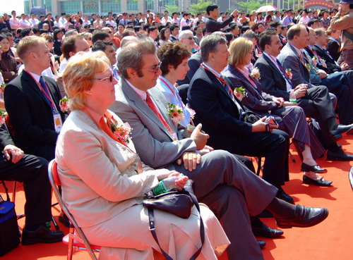 4月18日上午,和风丽日。30多名来自德国、意大利等国家的欧洲客商走出华夏新中源大酒店,结伴朝佛山国际会展中心走去。此时,佛山国际会展中心已是彩球飘扬,雄狮劲舞。第九届佛山(国际)陶瓷博览交易会开幕式会场商客云集,德国拓欧集团、佛亚展览(香港)有限公司总裁托马斯、中国陶瓷工业协会理事长杨自鹏、佛山市副市长李子甫、中国建筑卫生陶瓷协会会长丁卫东、禅城区副区长梁炳军、佛山市陶瓷行业协会秘书长尹虹等有关领导及叶德林、何新明、黄建平、张孟友等一批中国建陶巨头掌门人于主席台就坐。随着苏格兰风情乐队的乐器演奏,第九届佛山(国际)陶瓷博览交易会在众人的期盼中拉开了序幕。