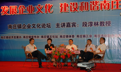 当天,中源朗高陶瓷副总邓耀邦、新明珠集团副总罗新家、兴发铝业副总吴锡坤与段教授还进行了互动沙龙。段教授和几位嘉宾就中国的企业如何持续发展企业文化等问题展开了热烈讨论,并对广大听众提出的实际问题进行了详细解答。在互动中,佛山市朗高陶瓷有限公司因推出国内首张陶瓷音乐专辑《唱响陶瓷》的事件,一度成为当天的热点话题。邓耀邦副总经理介绍道:“中源朗高是一个有着创新精神、学习精神、严谨精神的团队,2007年我们推出“激情飞跃梦想”的年度主题,并推出《唱响陶瓷》音乐专辑是创新精神的一个体现,也是企业文化,品牌文化建设的一个突破;我们希望通过音乐的形式把陶瓷人的责任感与追求表现出来,社会责任感正如段教授所说的,也是企业文化的一个重要体现。”他还结合《唱响陶瓷》歌曲及舞台剧正在进行的全国巡演的进展,并结合传统媒体与网络等新媒体的传播,指出建立企业文化不但需要不懈的努力与坚持,还要借助现代媒体扩大传播效果。