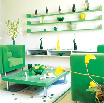 绿色调的搁板,上边同样摆设了绿色玻璃器皿装饰,让家更显清爽明快。