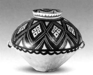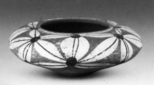 仰韶彩陶图案中尤其引人注意的,是分布在陕西化山附近的庙底沟类型彩陶,它们大多呈现出一种多方连续的美丽图案。其制作方法是,先在器坯上安排好装饰花纹带的部位,然后以圆点排列定位,再用线或是弧形三角纹将圆点联结起来,组成既均衡对称,又活跃生动的连续图案。仔细观察可以看出,它们是用阴阳纹结合的技法,来表现玫瑰花的覆瓦状花冠,以及花蕾、叶子和茎蔓。
