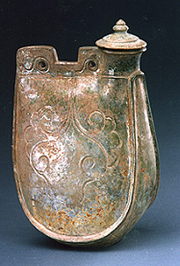 鸡冠壶是辽代的典型壶式之一,摹仿契丹族使用的各种皮囊容器而烧造的,亦称皮囊壶。因壶的上部有鸡冠状的穿孔,故称鸡冠壶。又因形似马蹬,俗称马蹬壶。鸡冠壶的烧制,体现了辽代统治者不忘自己是马背上的民族,以此来提醒自己不能忘本。