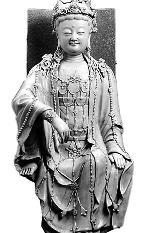 在首都博物馆“古代瓷器艺术精品展”的元代展厅内,有一件观音菩萨像特别引人注目,它就是元代景德镇窑青白釉水月观音菩萨像——首都博物馆的镇馆之宝。