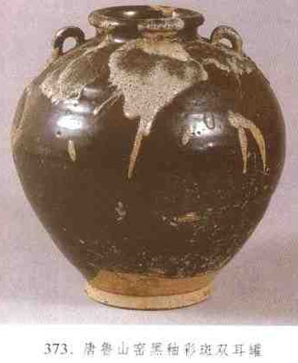 唐至元代瓷窑。窑址在河南鲁山段店。唐代南卓《羯鼓录》有“不是青州石墨,即是鲁山花瓷”的记载,说明唐代鲁山烧造的花瓷很有名。从采集的标本来看,“花瓷”是黑釉或褐釉上带白、月白等浅色斑纹装饰的器物,器形有拍鼓、瓶、壶、罐、碗、盘等。宋、金时窑场扩大,烧瓷品种丰富,装饰方法多种多样。白釉器物有炉、罐、碗、钵等。白釉上绘褐彩的点、圈点、花卉等几类纹饰。其中点纹排列方式有横向形、花朵形和三角形等。另有白釉划花、纹饰有荷叶、花草纹,器物为碗、枕,有以多组直线、曲线相间竖向排列组成的纹饰,有珍珠地划花、还有粗线纹的钵,用黑釉、酱釉装饰口沿的白釉碗。黑釉器物有线纹装饰,有满线与两线一组两种。有六角纹盘,盘中心素胎上有点彩花朵装饰。还有酱彩装饰的碗。酱釉有碗、罐等器物,青釉印花的几种纹饰与临汝等窑相近。此外,红绿彩碗、三彩凸雕莲瓣炉、绿釉狮形枕、划花枕、褐黄釉划花枕都具有鲁山窑特色。(见图373)