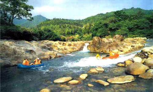 号称“华东第一漂”的石龙溪橡皮艇漂流,全程4公里,落差达36米,漂流需历时近3个小时。沿途森林茂密,野生动物成群,溪水清澈,溪流湍急,有69个弯,88个急流点。游人两人一组,挥桨击水,沿溪而下,惊涛骇浪,有惊无险,尽情潇洒。