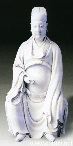 文昌头戴唐巾,两巾脚缚于后分垂颈肩,国字脸庞,丹凤眼,大耳,嘴角留裂缝以填充须髯。文昌右手执如意,左手自然下垂,两足登靴微露。胎白坚实厚重,釉呈乳白色,细腻莹润。整尊塑像显得雍容大度,衣袂圆润,富有层次变化,背部钤有“何朝宗印”方形印章。