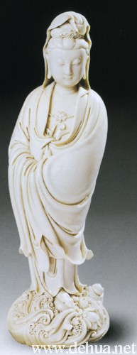 釉色白中泛黄,呈牙白色,如凝脂冻玉,滋润莹滑。观音双手藏袖,露一足踏莲花,另一足水花掩盖,作踏浪凌波渡海之势。观音神情娴雅平静,安详自若,双目低垂凝思。整座塑像精巧细致,神态如生,背钤有“何朝宗印”方形印章款。