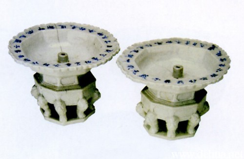 白釉泛青烛台(对),道光十年(1830年),高16.5厘米,口径2.5厘米,釉水白中微泛青,折沿口青花铭有“董坂宫章公相公炉前弟子黄允钦叩谢道光拾年仲冬吉日造立”等字样。