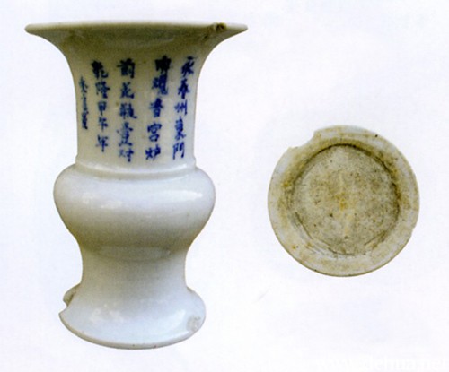 白釉泛青凤尾尊,乾隆甲午年(1774年),高18.5厘米,口径13厘米,瓶圆口外撇,底内凹圈足,白釉,微泛青色,器壁青花铭有“永春州东门内观音宫炉前花瓶壹对乾隆甲午年季长置’等字样。