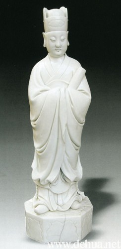 釉色白中闪黄,呈象牙色,温润细腻。文官头戴官帽,丹凤眼,鬓须以真毛填补,双手合拢于衣袖内,作执笏板状,神态闲然自若,立于台上,精雕细刻,线条圆润、流畅、洗练。底部仅留一小洞,系以整块瓷泥捏塑而成,胎体浑厚,有窑裂。