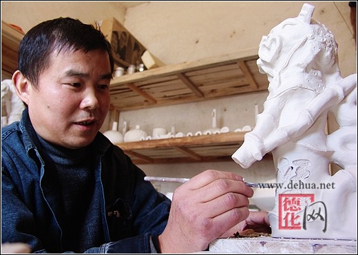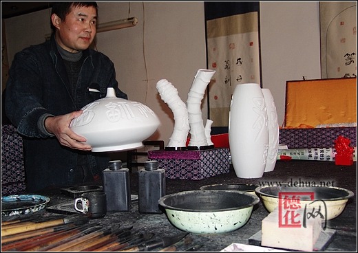 何燕丹来自江西九江,幼时即痴迷书法艺术,其篆隶书体达到形神、动静、虚实的和谐统一,作品先后在全国、省、市大赛中多次获奖。自1993年结缘德化后,他就开始尝试以刀代笔,运用传统金石刀法,将篆刻、书画艺术、陶瓷工艺融合为一体,先后开发出陶瓷印、瓷刻等系列瓷种。此次开发出立体书法瓷雕《舞》、《中国第一“龙”》、《福“猪”贺新》、《福》、《禄》、《寿》、《禧》等作品,生动形象、气韵流畅,具有较高的艺术价值和欣赏价值。