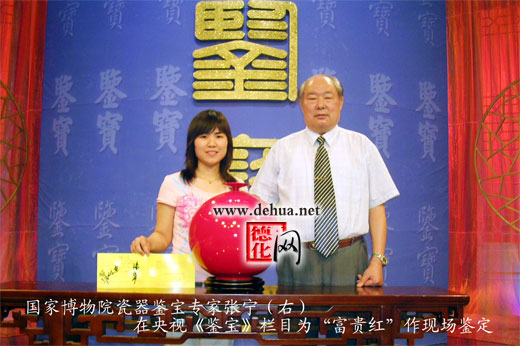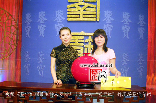 2006年8月,央视《鉴宝》栏目对德化瓷器富贵红“天地方圆”红釉盘口球体瓶作现场鉴定评点。这是现代瓷器第一次进入《鉴宝》栏目。