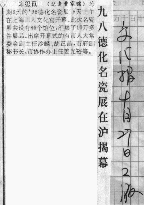 本报讯 (记者曹家骧)为期8天的’98德化名瓷展昨天上午在上海工人文化宫开幕。此次名瓷展共没有86个馆位.汇集了10万多件展品。出席开幕式的有市人大常委会副主任沙麟、胡正昌,市府副秘书长、市协作办主任萎光裕等。