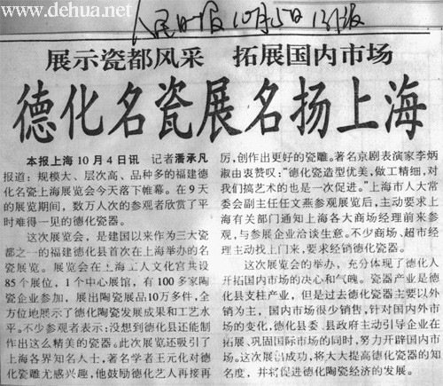 这次展览会,是建国以来作为三大瓷都之一的福建德化县首次在上海举办的名瓷展览。展览会在上海工人文化宫共设 85个展位,1个中心展馆,有l00多家陶瓷企业参加,展出陶瓷展品l0万多件,全方位地展示了德化陶瓷发展成果和工艺水平。不少参观者表示:没想到德化县还能制作出这么精美的瓷器。此次展览还吸引了上海各界知名人士,著名学者王元化对德化瓷雕尤感兴趣,他鼓励德化艺人再接再厉,创作出更好的瓷雕。著名京剧表演家李炳淑由衷赞叹:“德化瓷造型优美,做工精细,对我们搞艺术的也是一次促进。”上海市人大常委会副主任任文燕参观展览后,主动要求上海有关部门通知上海各大商场经理前来参观,与参展企业洽谈生意。不少商场、超市经理主动找上门来,要求经销德化瓷器。