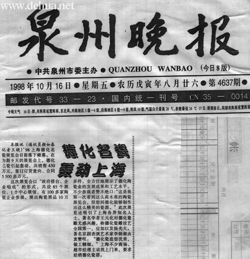 这次展览会以“政府搭台、企业唱戏”的形式,共设85个展位、1个中心展馆,有100多家陶瓷企业参展,展出陶瓷展品10万多件,全方位地展示了德化陶瓷业的发展成果和工艺水平。不少参观者赞不绝口:“这是我第一次看到这么高水准的陶瓷展览会,没想到德化能够制作出这么精美的瓷器。”此次展览还吸引了上海各界知名人士,著名学者王元化对德化瓷雕尤感兴趣,称德化瓷雕技艺全国第一,应加以发扬光大。著名京剧表演艺术家李炳淑由衷赞叹:“德化瓷造型优美,做工精细。”上海不少商场、超市经理主动找上门来,要求经销德化瓷器。