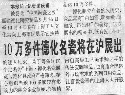 被誉为“中国陶瓷之乡”福建德化陶瓷精品9月26日至10月4日将在上海工人文化宫向上海市民展示它独特的迷人陬采。为了筹备好这个定名为“上海·德化名瓷展,览”,德化县政府严格筛选,精心组织当地100多家较有影响力的陶瓷企业参展,荟集精品达lO万多件。