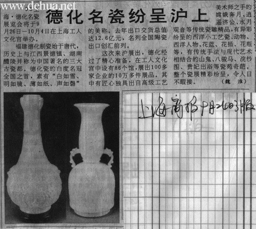9 8上海·德化名瓷展览会将于9月26日一10月4日在上海工人文化宫举办。