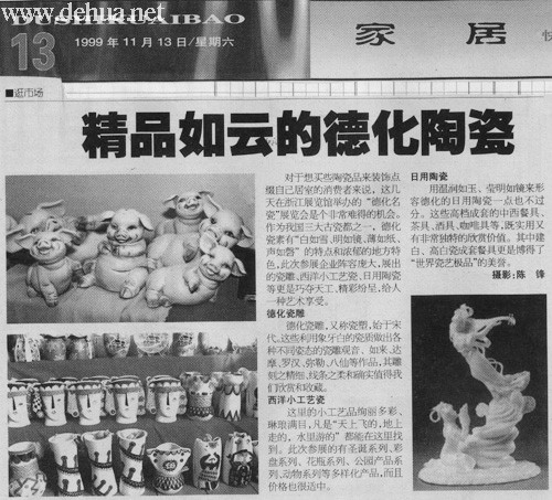 对于想买些陶瓷品来装饰点缀自己居室的消费者来说,这几天在浙江展览馆举办的“德化名瓷”展览会是个非常难得的机会。作为我国三大古瓷都之一,德化瓷素有“自如雪、明如镜、薄如纸、声如磬”的特点和浓郁的地方特色,此次参展企业阵容庞大,展出的瓷雕、西洋小工艺瓷、日用陶瓷等更是巧夺天工、精彩纷呈,给人一种艺术享受。
