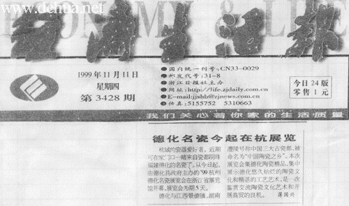 杭城的瓷器爱好者,近期可在家门口一睹来自瓷都明珠福建德化的名瓷了。从今日起,由德化县政府主办的’99杭州德化名瓷展览会在浙江省展览馆开幕,展览会为期5天。