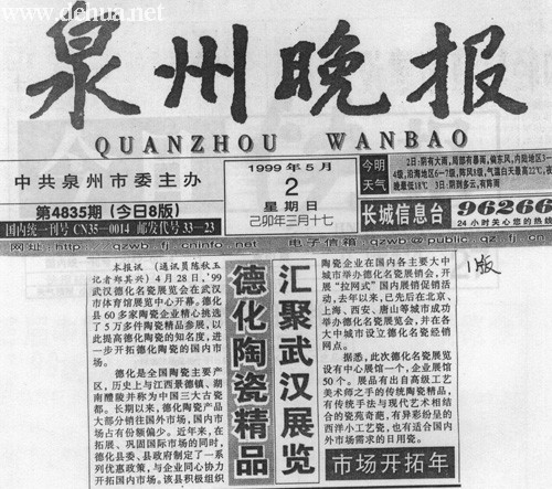 德化是全国陶瓷主要产区。历史上与江西景德镇、湖南醴陵并称为中国三大古瓷都。长期以来,德化陶瓷产品大部分销往国外市场,国内市场占有份额偏少。近年来,在拓展、巩固国际市场的同时,德化县委、县政府制定了一系列优惠政策,与企业同心协力开拓国内市场。该县积极组织陶瓷企业在国内各主要大中城市举办德化名瓷展销会,开展“拉网式”国内展销促销活动,去年以来,已先后在北京、上海、西安、唐山等城市成功举办德化名瓷展览会,并在各大中城市设立德化名瓷经销网点。