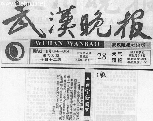 本报讯中国古代大古瓷都之一的德化县将于二十八日至五月一日在湖北体育展览中心给江城市民献上一台瓷支好戏,十万多名瓷演员登台亮相。其中,有出自名家之手的瓷雕精品,有美观实用的日用瓷,更有千姿进态的西洋小工艺瓷。(钟琼)