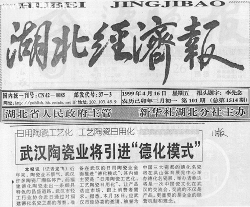 本报讯(记者 龙飞) 近年来。陶瓷业不景气,武汉许多陶瓷厂濒临停产.而福建德化陶瓷走出一条颇具特色的昌盛道路。武汉市轻工行业协会近日通过对福建德化名瓷之都的考察,准备在武汉的日用陶瓷业全面推进“德化模式”,其内涵主要是“日用陶瓷工艺化、工艺陶瓷日用化”。让产品适应市场,跟上消费者需求。据悉,本月28日,应武汉市经协委的邀请,被誉为中国三大瓷都的德化名瓷将在洪山体育展览中心举办德化名瓷展,举办者称这将是一次中国瓷文化在武汉的交流会,交流的不仅是产品,更重要的是企业的经营机制和理念。